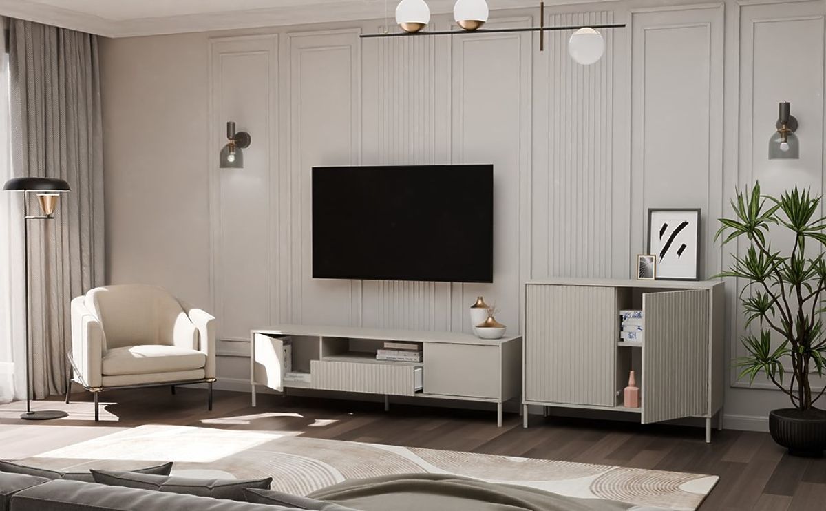 COLOR: CASHMEREELEGANCE AND PRACTICALITY IN ONEThe KAMARO 2D SLIM CASHMERE dresser is a blend of aesthetics and functionality, perfect for the living room, guest room, bedroom, or study. The grooved front panel of the doors (reminiscent of slats) gives the furniture a modern and original look that fits perfectly into contemporary interiors.
