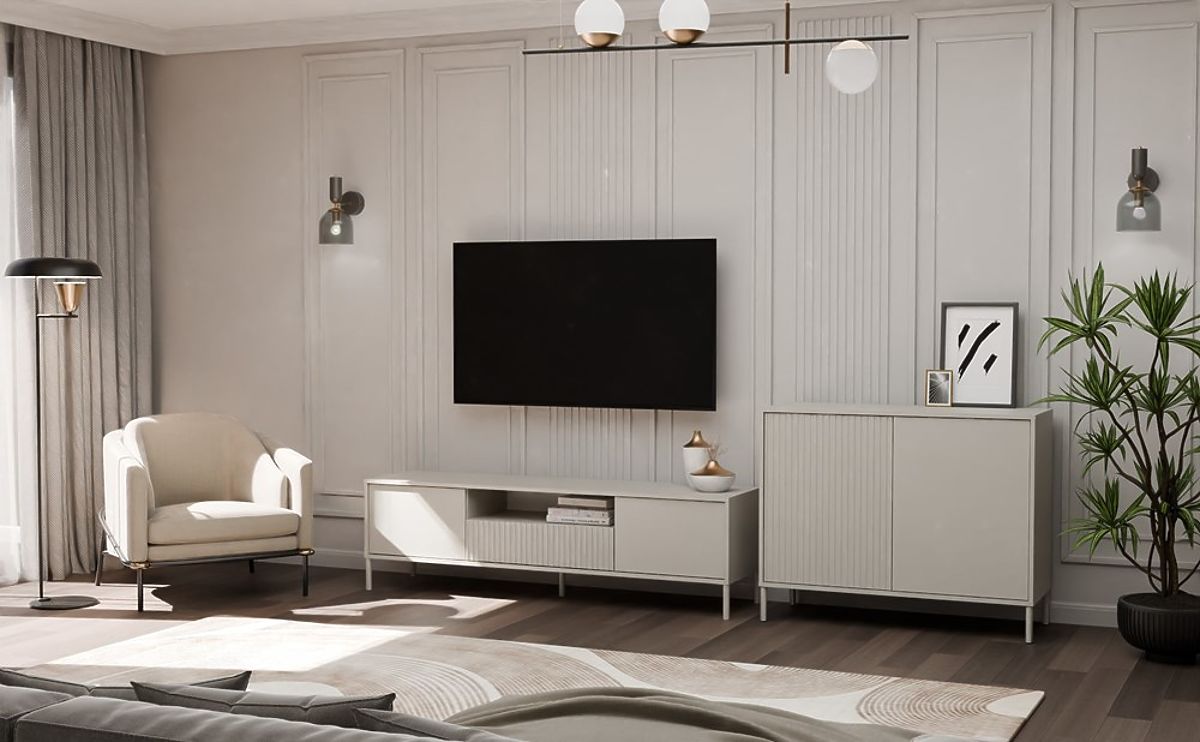 COLOR:The KAMARO 2D SLIM/SMOOTH CASHMERE sideboard combines aesthetics and functionality, making it perfect for the living room, guest room, bedroom, or office. The combination of a smooth front panel with a slatted one gives the furniture a modern and original look, perfectly suited for contemporary interiors.