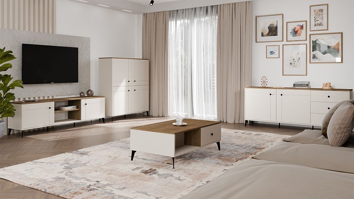 The POINT 4D sideboard is designed for those who value style, functionality, and high-quality craftsmanship. The combination of the fashionable cashmere shade with the natural decor of the Oak Castello top gives the furniture a timeless character that complements both modern and classic interiors.