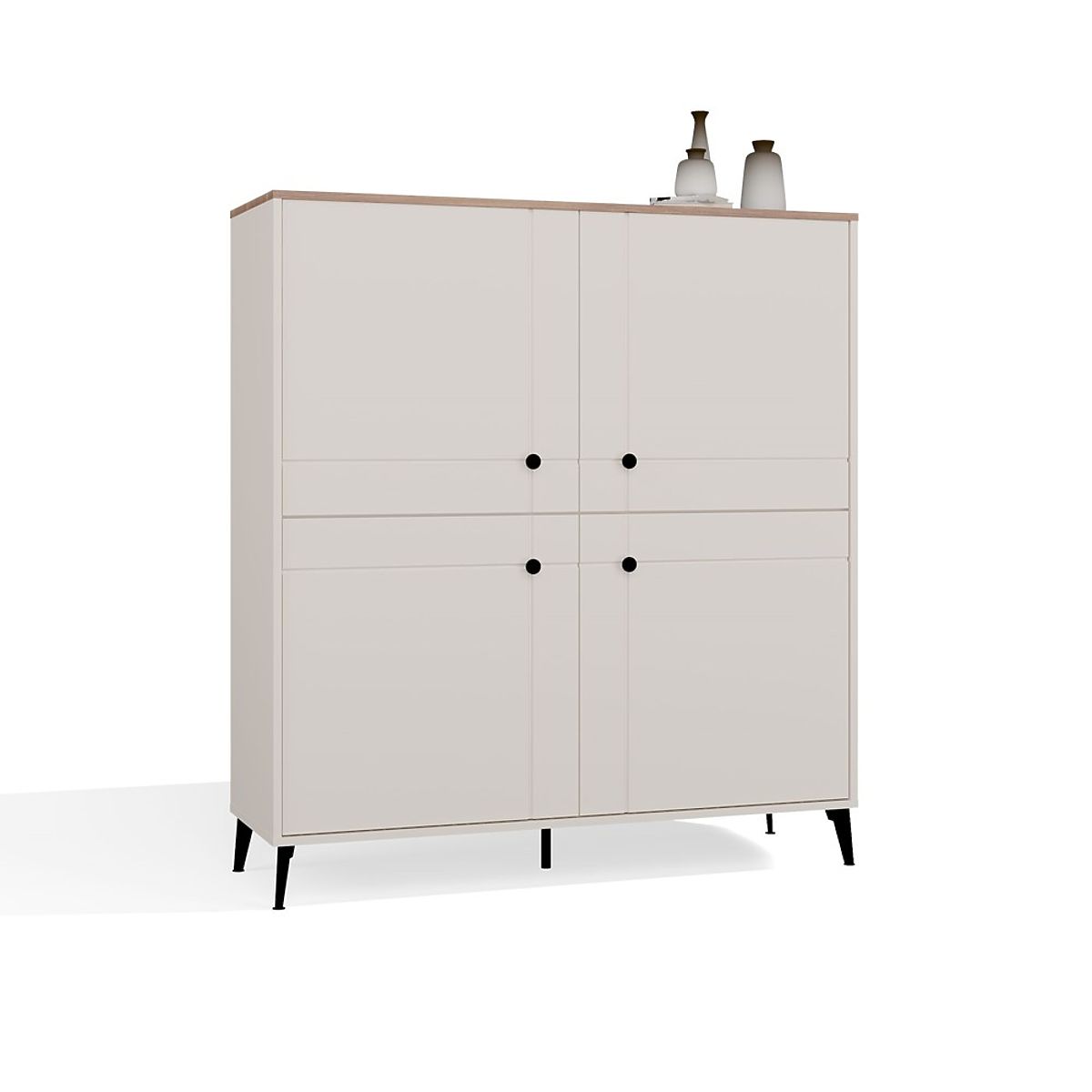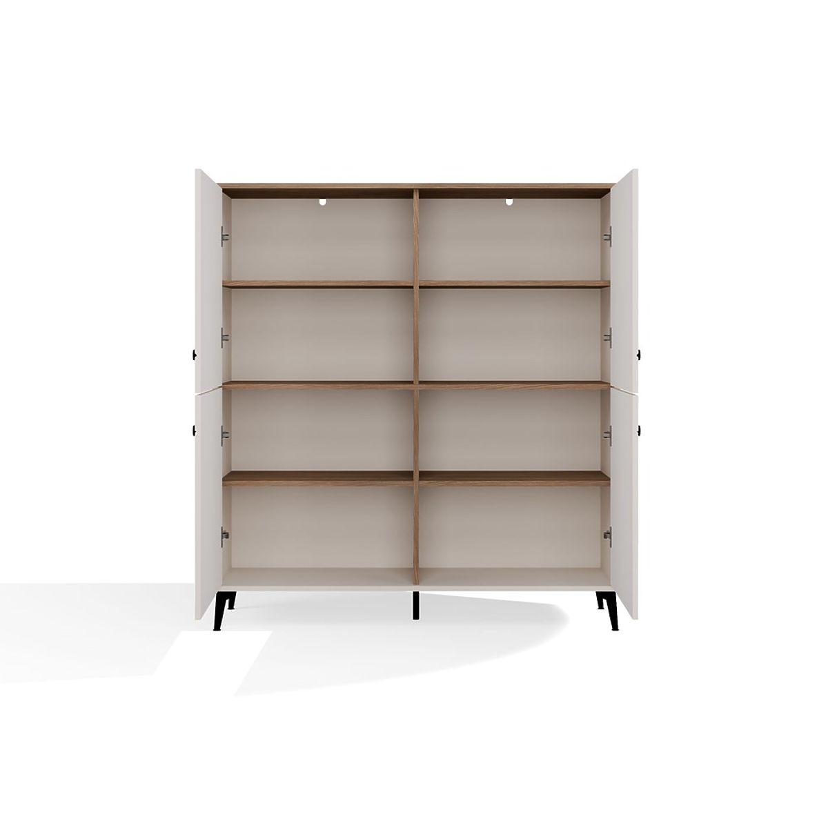 The model features four front doors with soft-closing mechanisms, concealing up to eight practical shelves—ideal for storing books, documents, textiles, or everyday accessories.