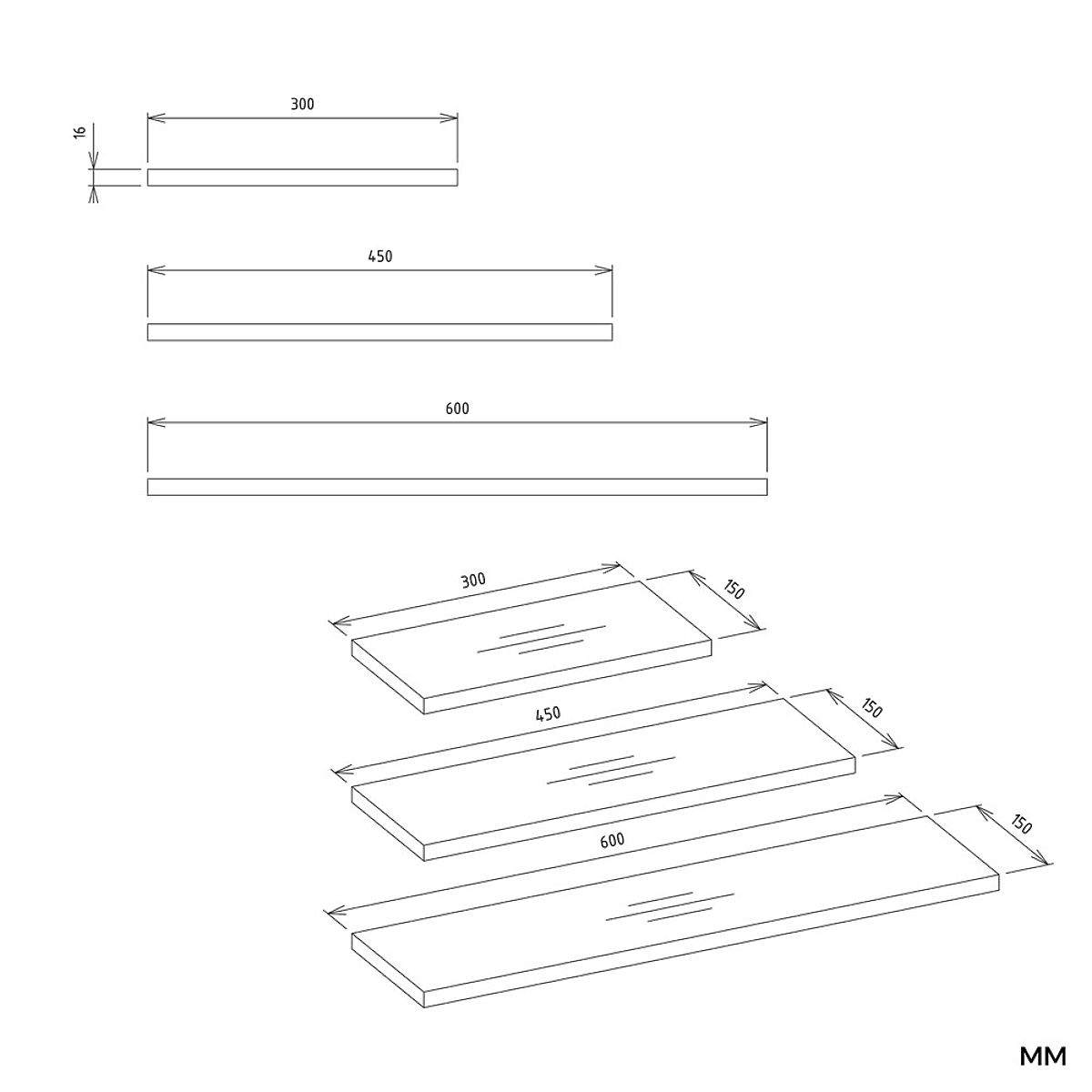 The shelves are made of laminated furniture board with a thickness of 16 mm
