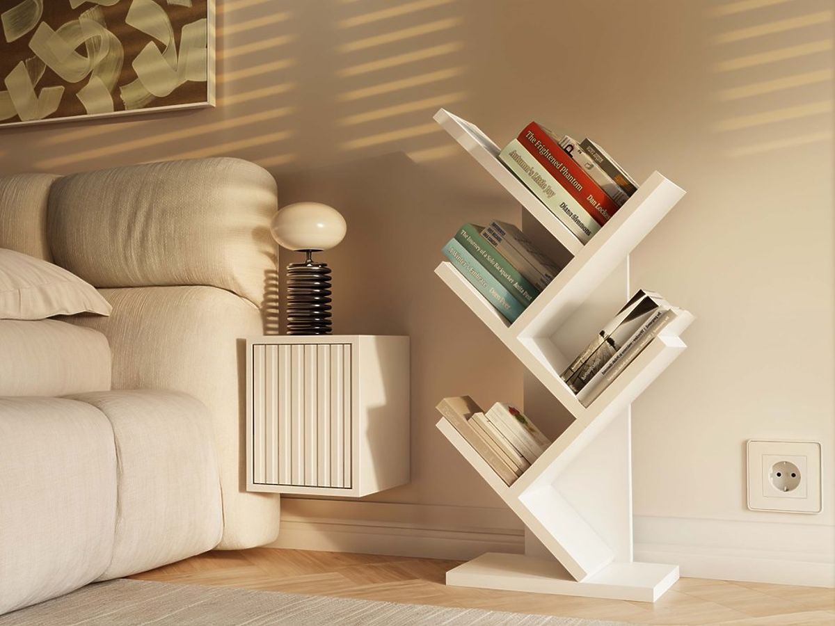 The Funny Mini shelf is a smaller version of the popular Funny model, designed with small spaces in mind. It is ideally suited for the living room, office, children's or student's room. Thanks to its original geometric shape and slanted shelves, it allows for aesthetic and convenient storage of books, magazines, files, toys, and small items.
