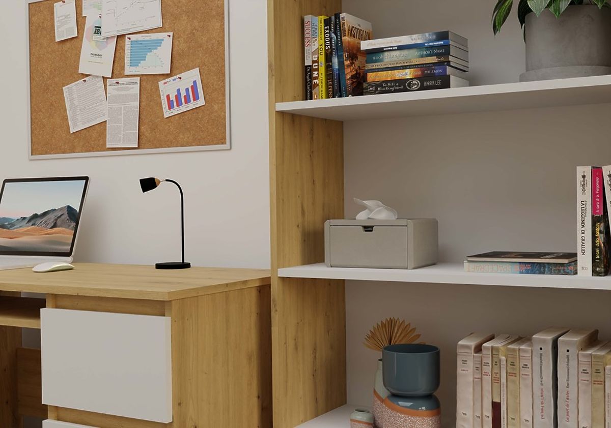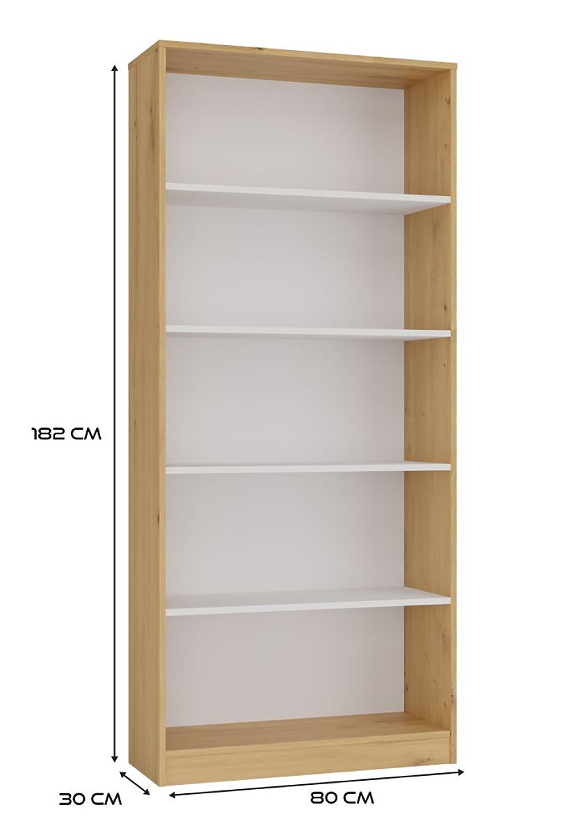 The R80 shelf is a stylish and practical solution for storing books, files, decorations, and office materials. The combination of the warm shade of artisan oak with contrasting white shelves gives the furniture a modern and elegant character. It is perfect for an office, living room, children's room, or home library.