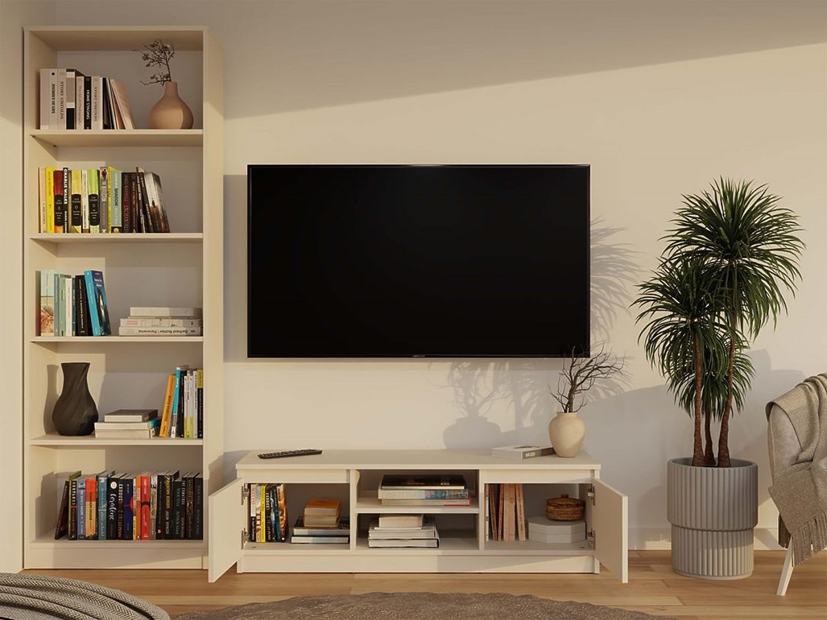 Two side cabinets without shelves inside for convenient storage of various devices and small items.