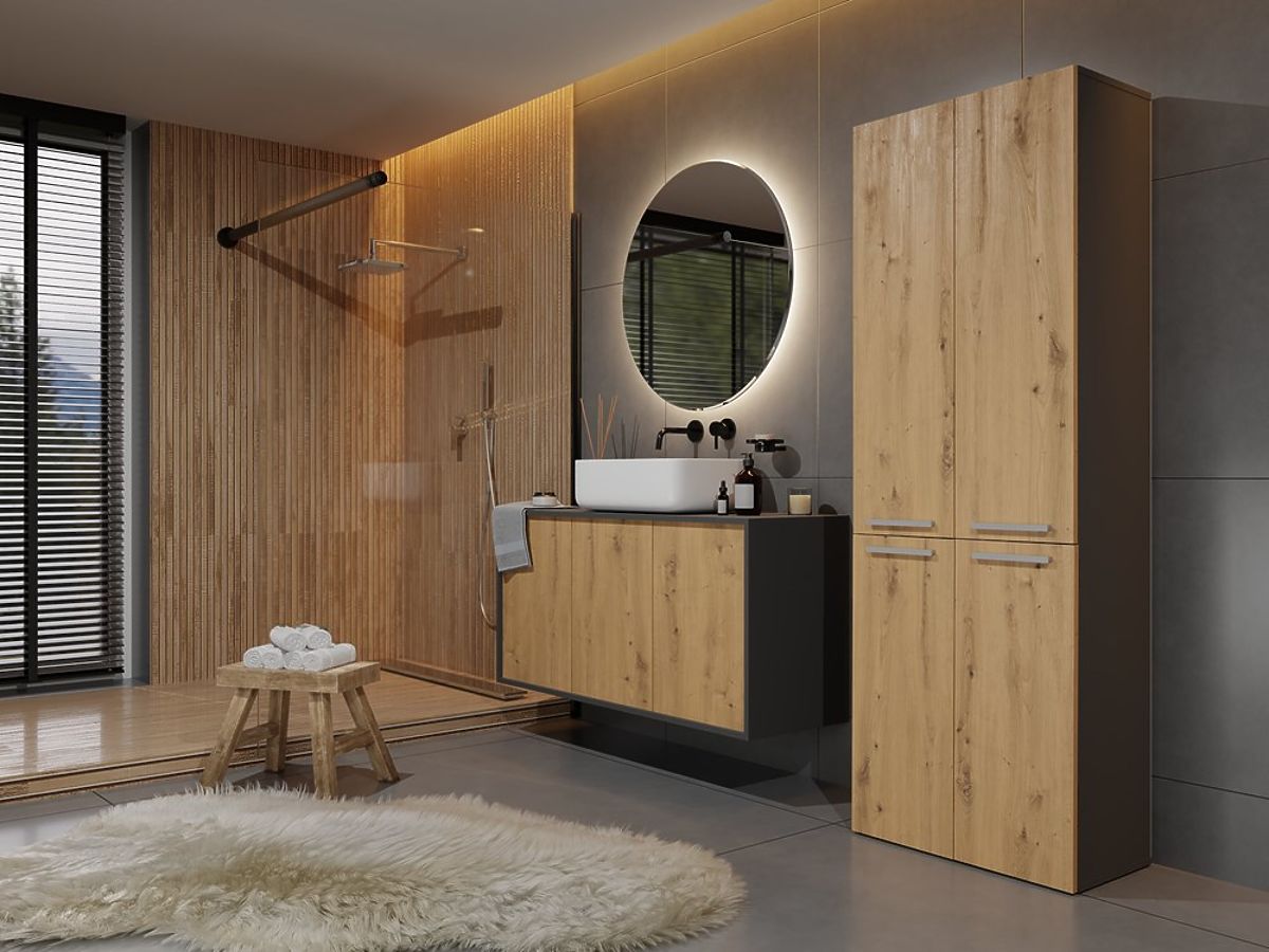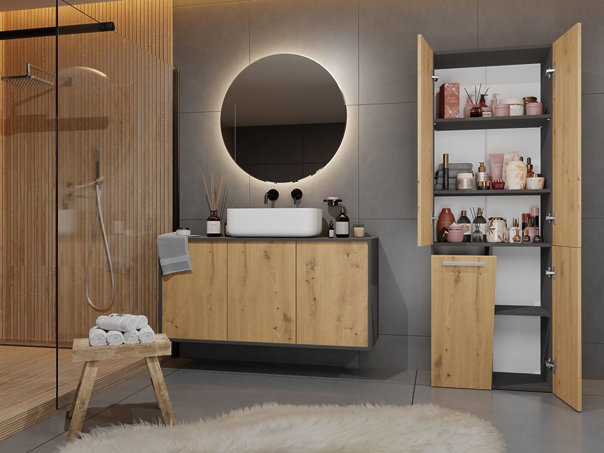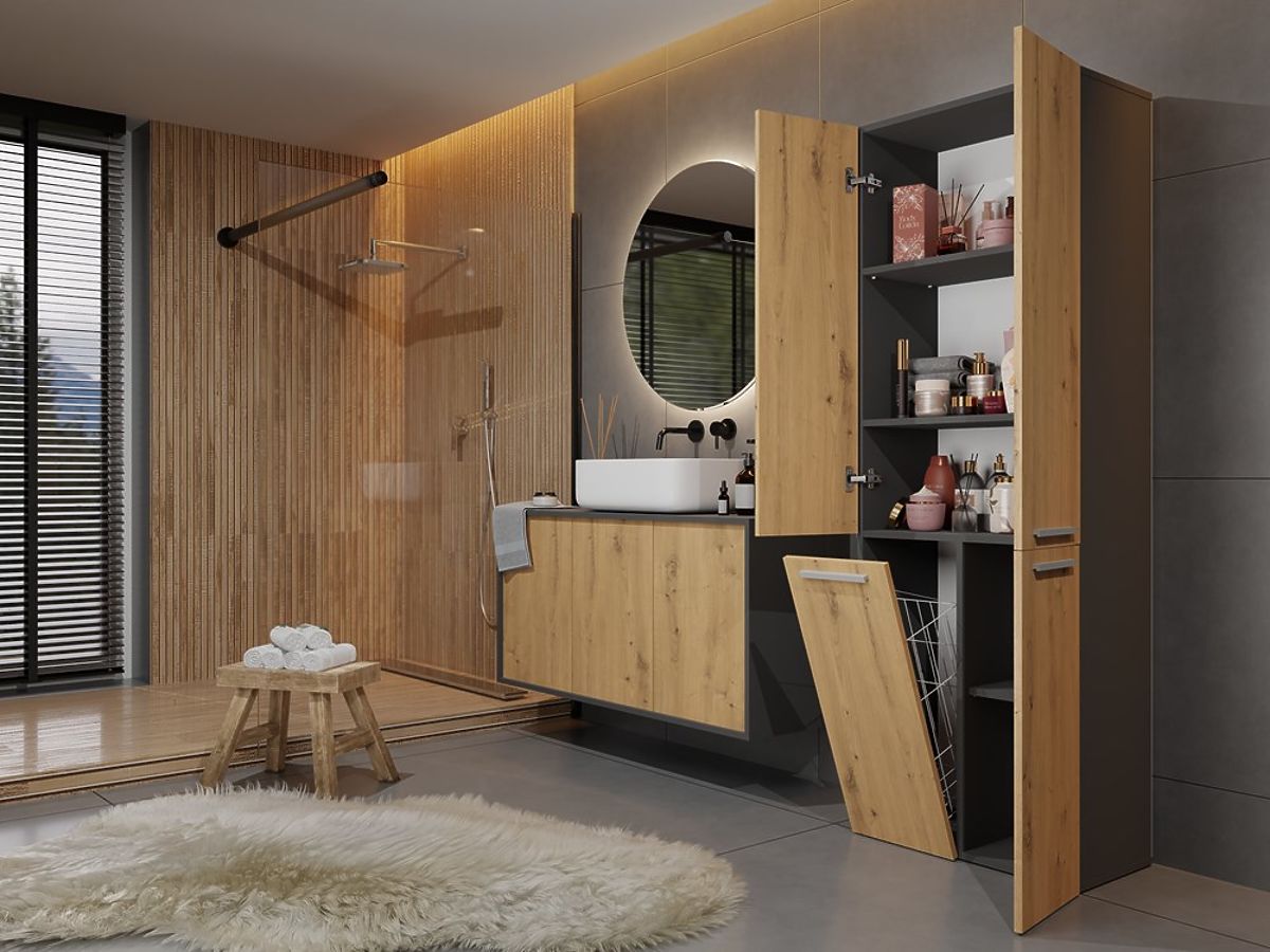 Anthracite and artisan oak bathroom cabinet with shelves and basket. .. more