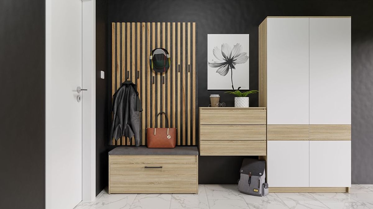 The shoe cabinet is made of 16 mm thick laminated board resistant to abrasion