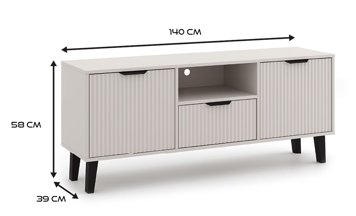 The TV cabinet SCANDI 2D1S SLIM combines functionality and aesthetics, perfect for lovers of simple yet stylish interiors. The grooved front surfaces and slim form on high black legs give the furniture lightness and a distinctive character.