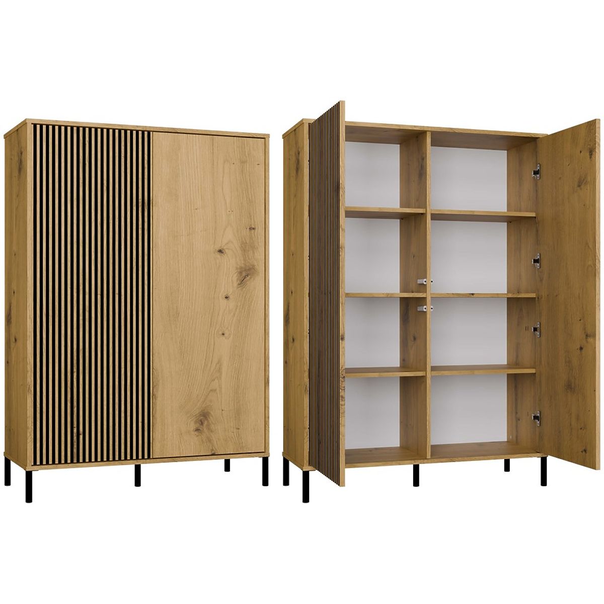 COLOR:The display cabinet KAMARO 2DD SLIM/SMOOTH ARTISAN OAK combines aesthetics and functionality, making it perfect for the living room, guest room, bedroom, or office. The combination of smooth front doors and grooved front doors reminiscent of slats adds character, while the TIP-ON system allows for convenient handle-free use. The furniture provides ample storage space while being a stylish element in a modern interior.