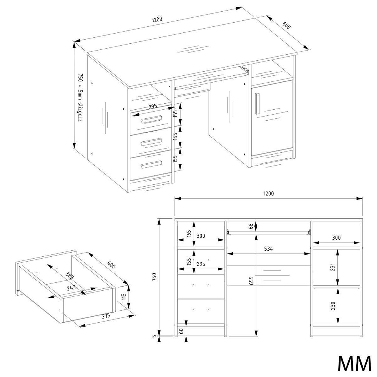 - Body and front – made of high-quality laminated chipboard, 16 mm thick, scratch-resistant and easy to maintain.
