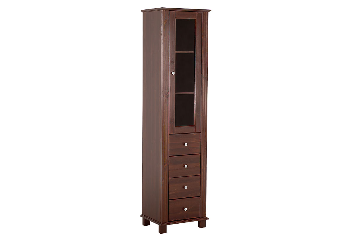 Brown tall cabinet with 1 door and 4 drawers, made of natural wood. .. more