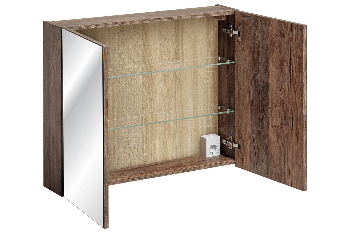 Cabinet with mirror, 80 cm wide, features 2 doors and multiple storage spaces. .. more