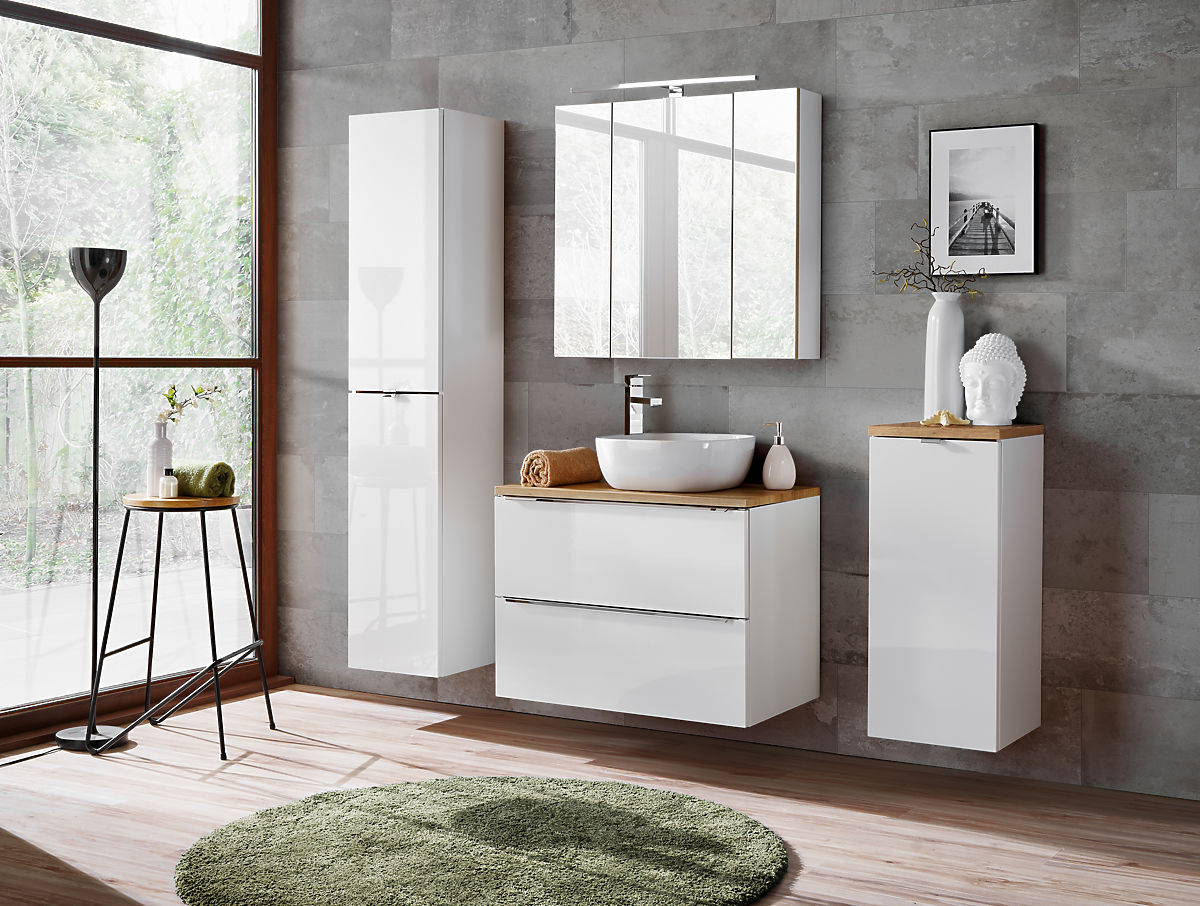 Wall-mounted cabinet with two drawers, compatible with various sink types. .. more