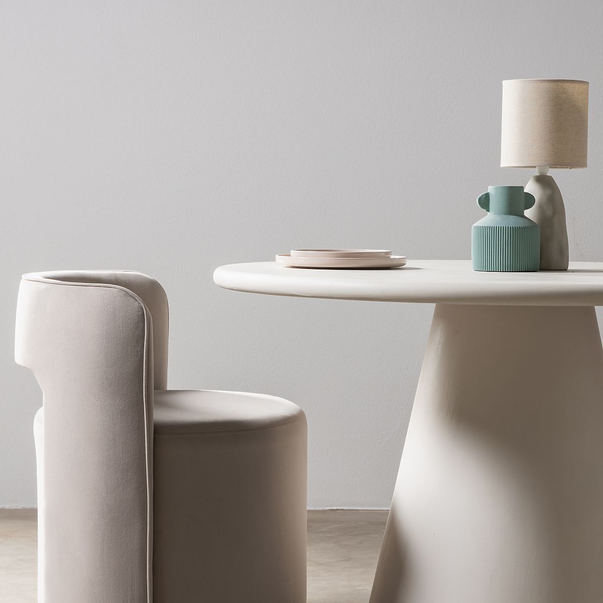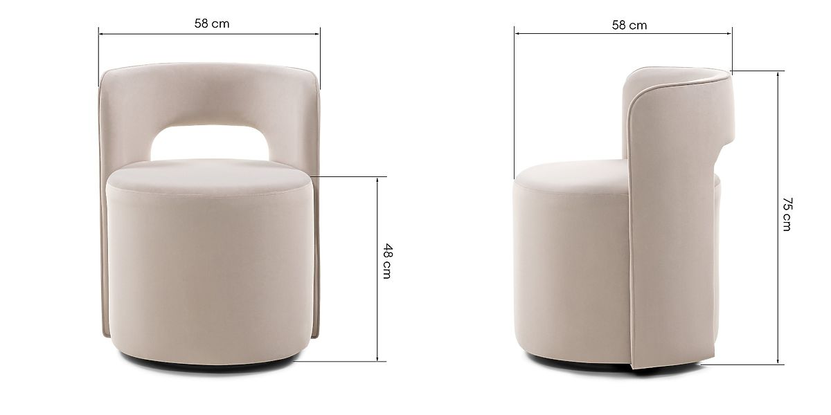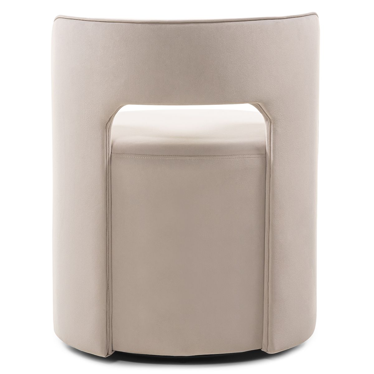 Beige velvet swivel chair with a decorative backrest cutout. .. more