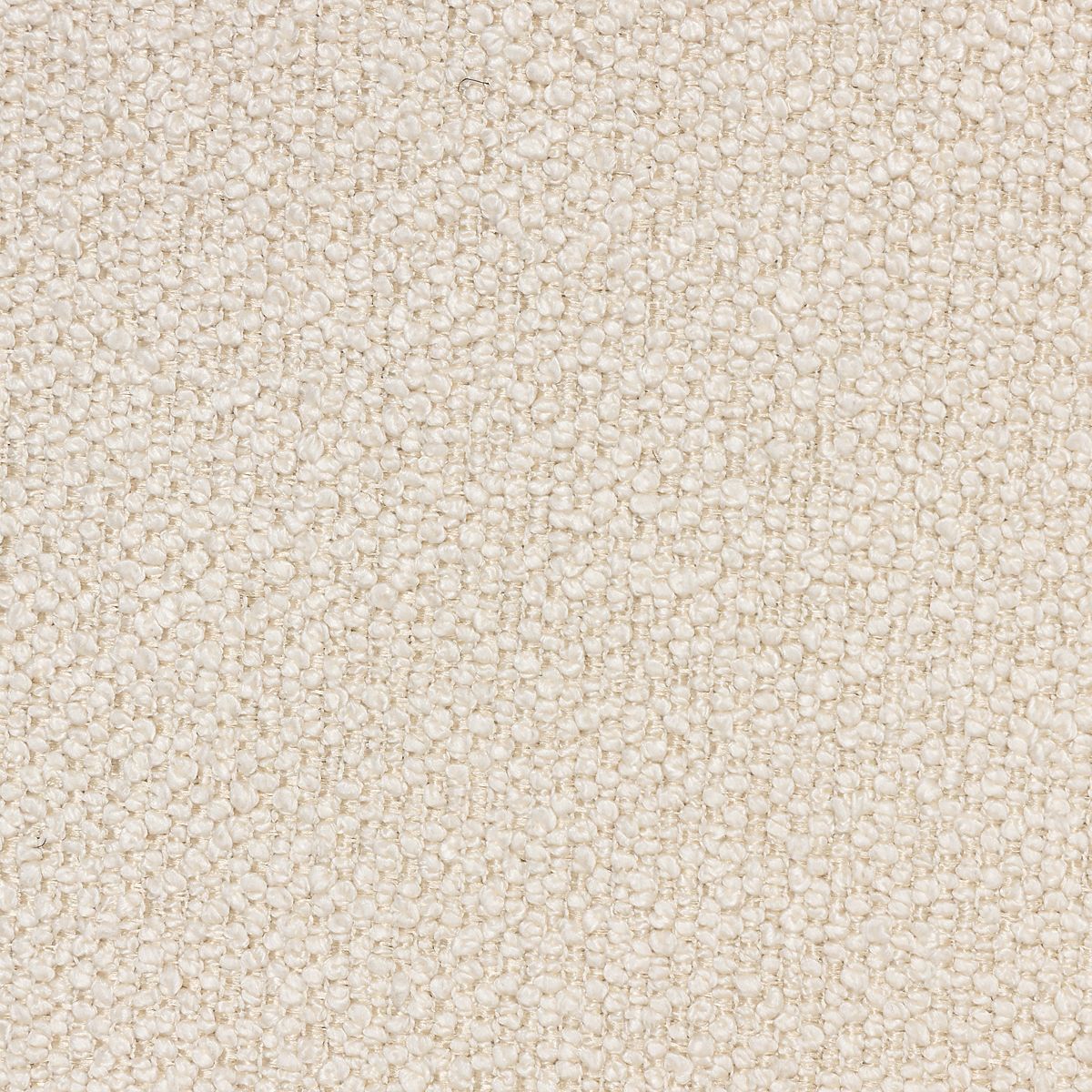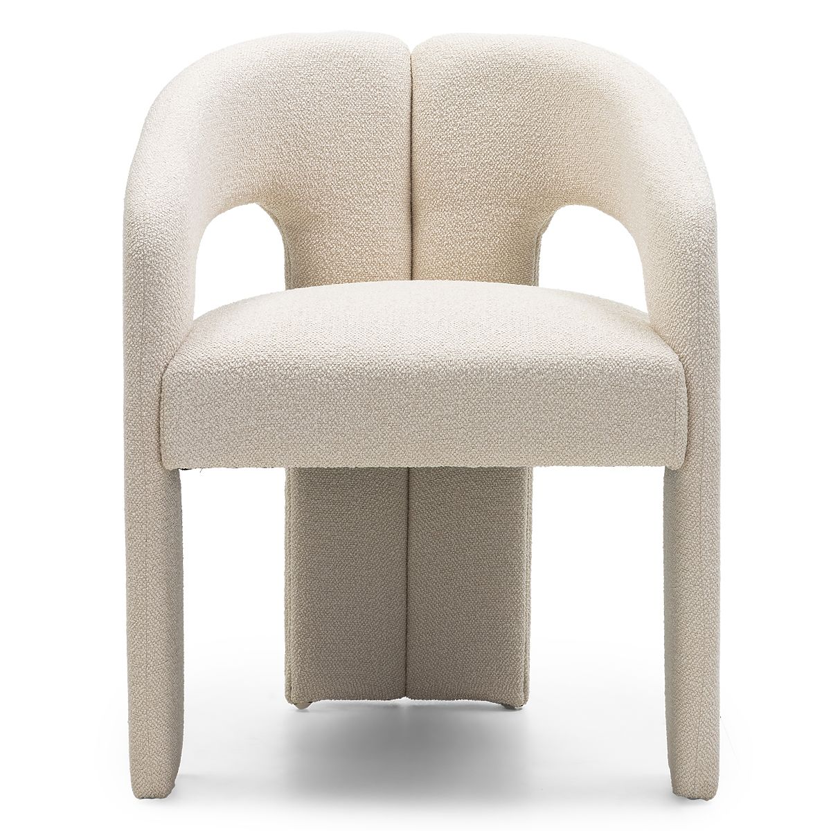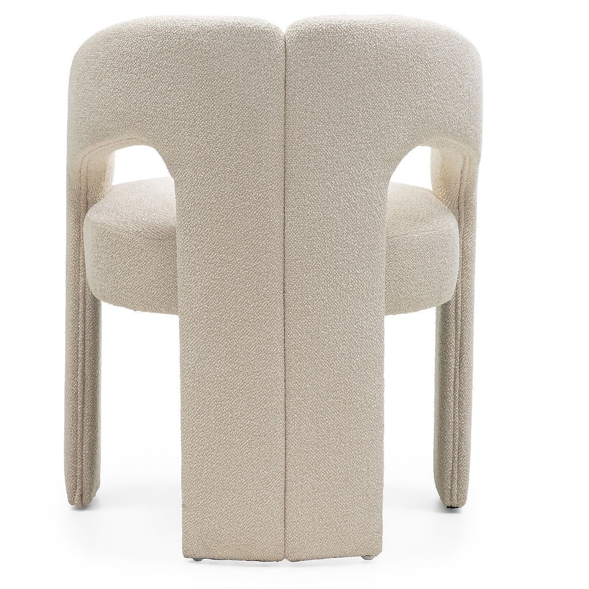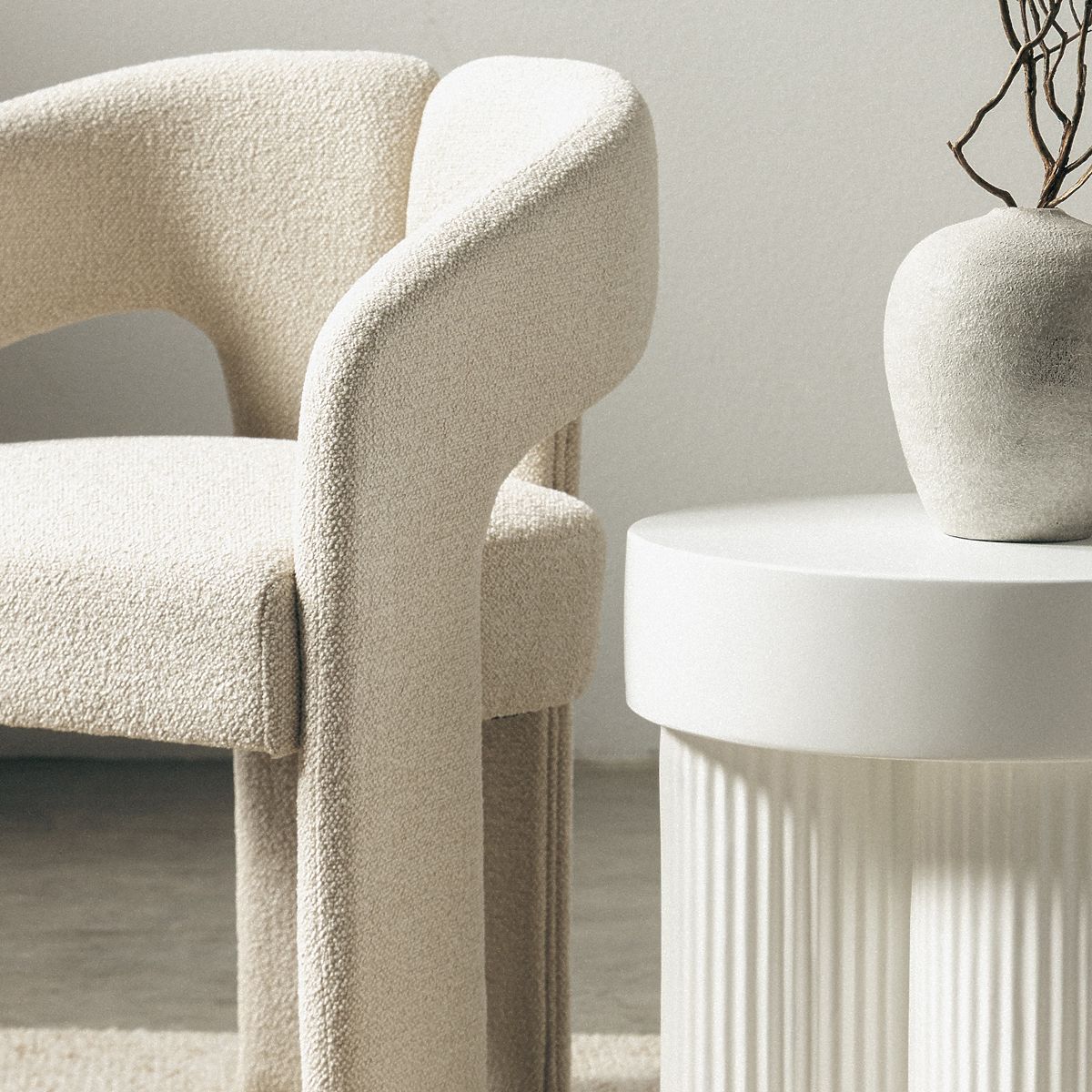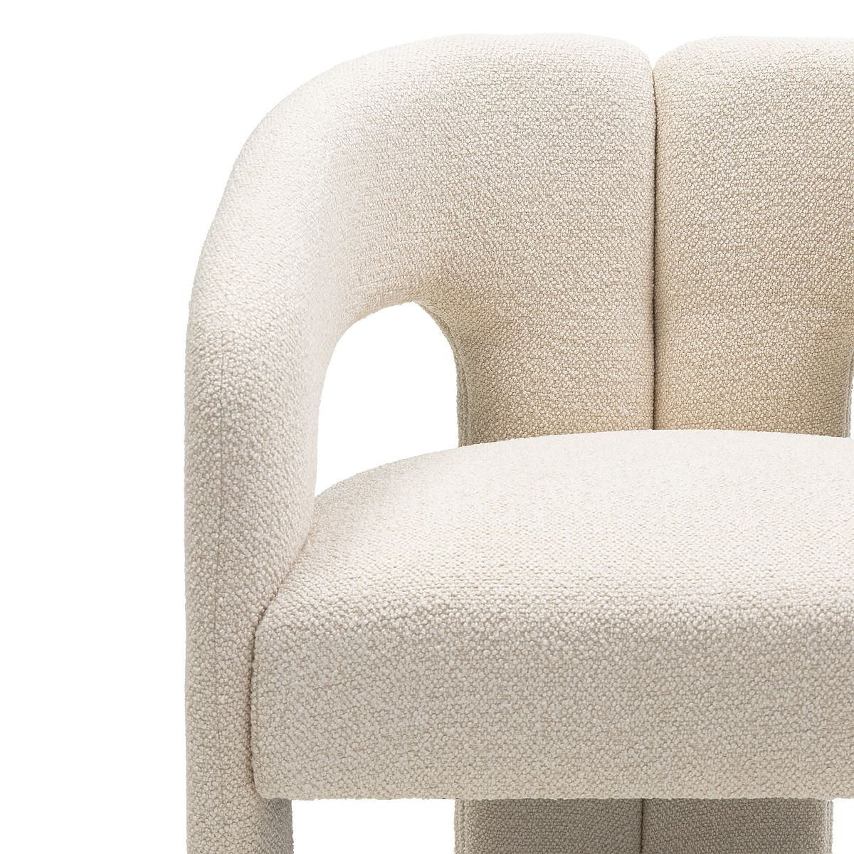 Beige upholstered chair with rounded shapes and unique arch design. .. more