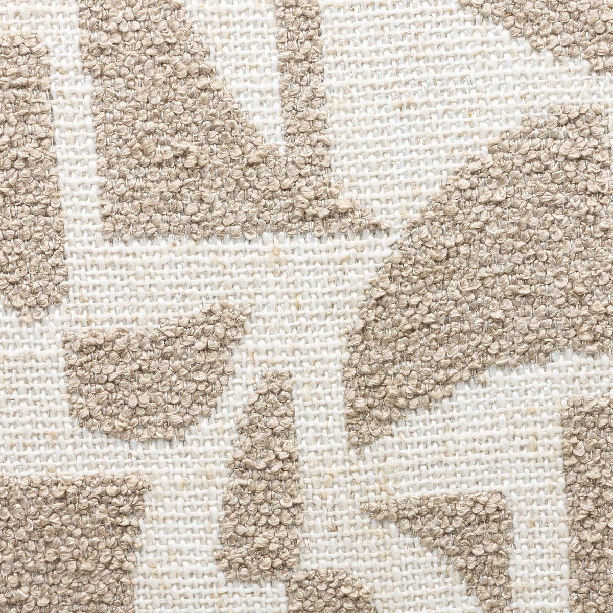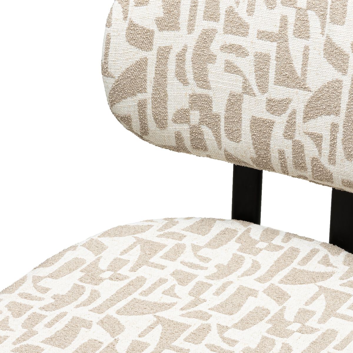 Upholstered chair with a geometric beige-cream pattern and black metal legs. .. more